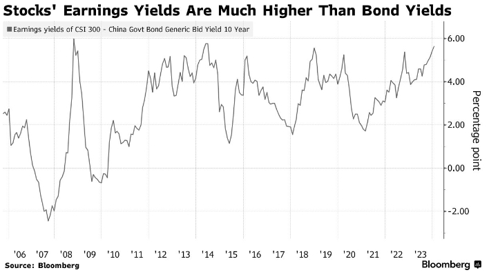 По сравнению с облигациями, китайские акции редко стоили так дешево. Доходность эталонного индекса CSI составляет около 8%, что на 5,7 процентных пункта выше доходности 10-летних облигаций. С 2005 года разрыв редко был таким большим. Аналогичным образом, дивидендная доходность эталонных акций превысила доходность долгосрочных облигаций впервые как минимум с 2005 года.