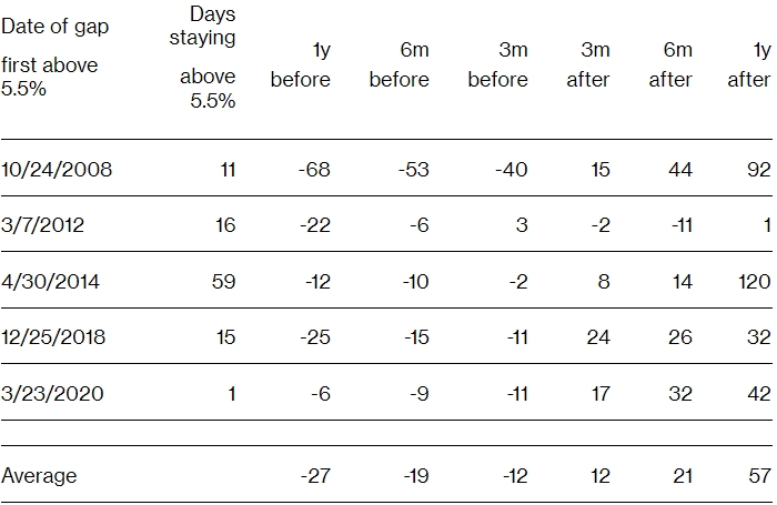 За почти два десятилетия было пять предыдущих периодов, когда разрыв в доходности акций и облигаций достигал 5,5 пунктов и более, в том числе во время финансового кризиса 2008 года и пандемии в 2020 году. Каждый раз акции росли в последующие 12 месяцев, принося колоссальную доходность. В среднем 57%.