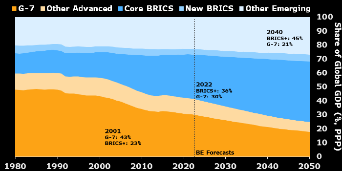 Доля G7 (оранжевым), других развитых стран (желтым), первоначальных членов БРИКС (синим), новых членов БРИКС (голубым) и других развивающихся стран (светло-голубым) в мировом ВВП (по ППС, исторические данные и прогноз Bloomberg Economics). Источник: Bloomberg