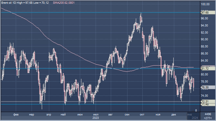 Фьючерсы на Brent в понедельник, 8 января, упали в цене на 3% до $76,38/барр.