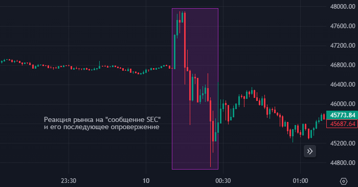 В ночь со вторника на среду Комиссия по ценным бумагам и биржам США (SEC) сообщила в соцсети X, что готовится одобрить запуск биржевых фондов (ETF) на биткоин. Данная новость спровоцировала взлет цены биткоина, поскольку инвесторы давно этого ждут. Однако рост котировок продолжался недолго, так как вскоре SEC сообщила о том, что ее аккаунт в X был взломан.