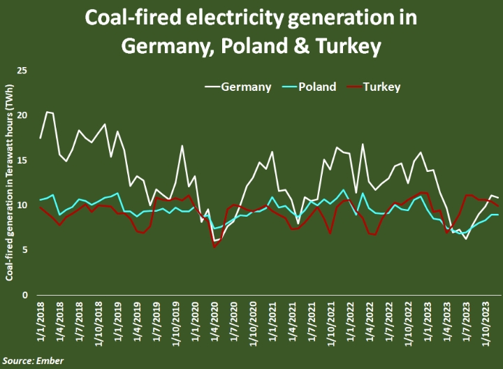 Однако в последние месяцы 2023 года каждая страна увеличила производство электроэнергии на угле по мере роста спроса на отопление, хотя общая выработка электроэнергии на угле в каждой стране остается значительно ниже предыдущих максимумов.
