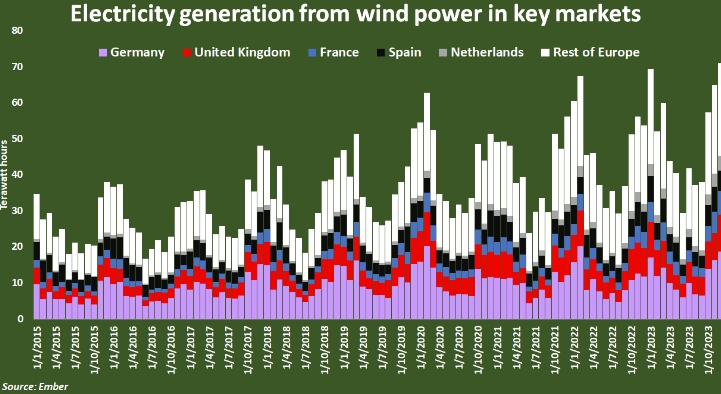 Производство электроэнергии за счет энергии ветра на ключевых рынках. Германия (фиолетовая гистограмма), Великобритания (красная), Франция (голубая), Испания (черная), Нидерланды (серая) и остальная Европа (белая). Источник: Ember