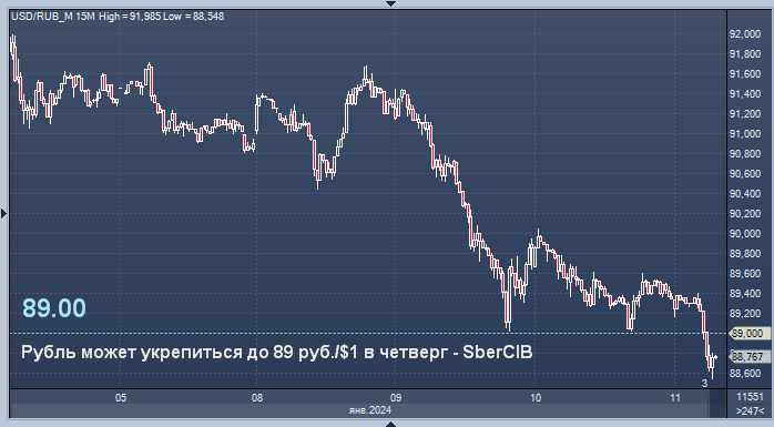 "Рубль в среду вновь подорожал руб./$1, но пока не смог закрепиться около этого уровня. В четверг Минфин объявит объем покупок валюты по бюджетному правилу в январе, и мы ждем, что он составит примерно 5 млрд рублей в день. С учетом того, что ЦБ в январе продает 12,6 млрд рублей в день в связи с использованием средств ФНБ в прошлом году, итоговый объем продаж составит примерно 7 млрд рублей в день, что довольно много. Это позитивно для рубля, и мы ожидаем, что сегодня он закрепится около 89 руб./$1", - пишут аналитики SberCIB Investment Research.