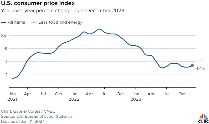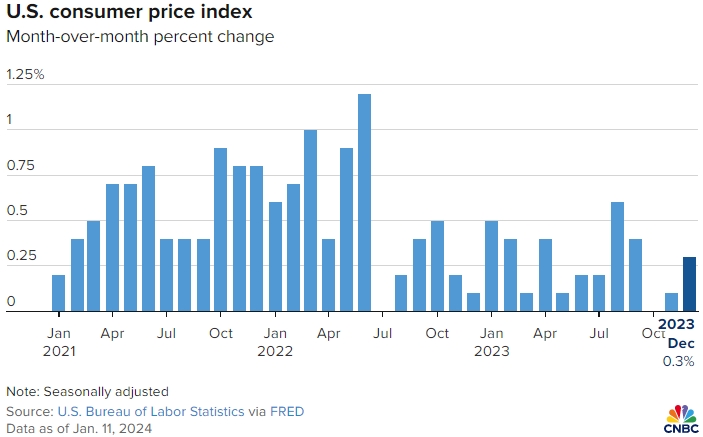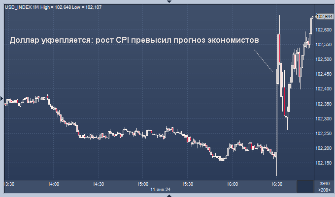 Индекс потребительских цен за месяц вырос на 0,3%, что выше оценки аналитиков в 0,2%, в то время как большинство экономистов и политиков ждут ослабление инфляционного давления. За 12 месяцев индекс потребительских цен закрыл 2023 год ростом на 3,4%. Экономисты, опрошенные Dow Jones, ожидали соответствующих значений в 0,2% и 3,2%.
