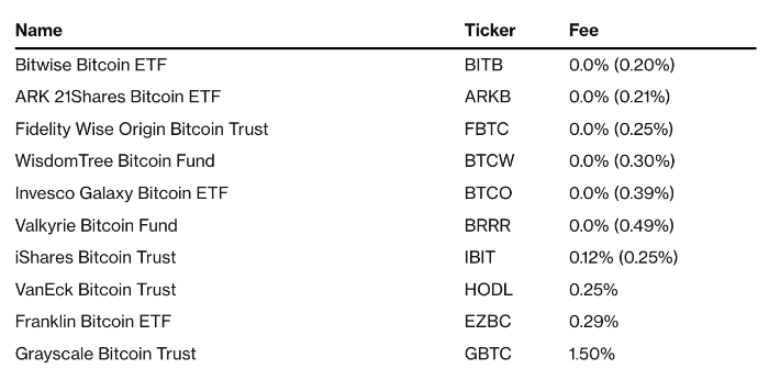 Примечание: Bitwise, ARK, WisdomTree отменяют плату за первые шесть месяцев и/или активы в размере миллиарда долларов. Invesco отменит комиссию за первые шесть месяцев и/или активы в размере 5 миллиардов долларов. IShares снизит комиссию за первые 12 месяцев и/или активы на 5 миллиардов долларов. Valkyrie откажется от платы за первые три месяца. Fidelity не будет взимать комиссию до 31 июля 2024 года.