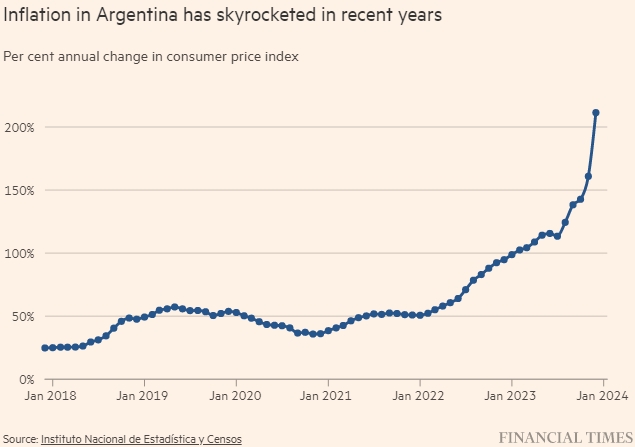 Годовой уровень инфляции в Аргентине достиг 211,4 процента в декабре, сообщило статистическое агентство страны в четверг, подтвердив глубину экономического кризиса, с которым сталкивается страна и ее новый президент-либертарианец Хавьер Милей.
