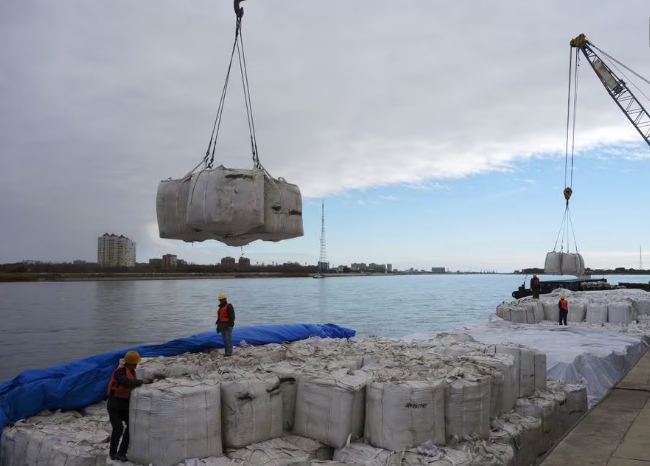 Рабочие стоят возле крана, разгружающего мешки с импортированными из России соевыми бобами в порту Хэйхэ в провинции Хэйлунцзян, Китай. Снимок сделан 10 октября 2018 года. REUTERS/Stringer