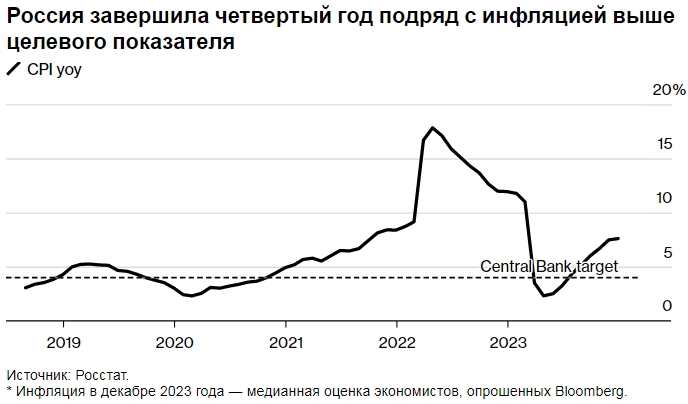 Россия завершила четвертый год подряд с инфляцией выше целевого показателя. Источник: Росстат. * Инфляция в декабре 2023 года — медианная оценка экономистов, опрошенных Bloomberg.