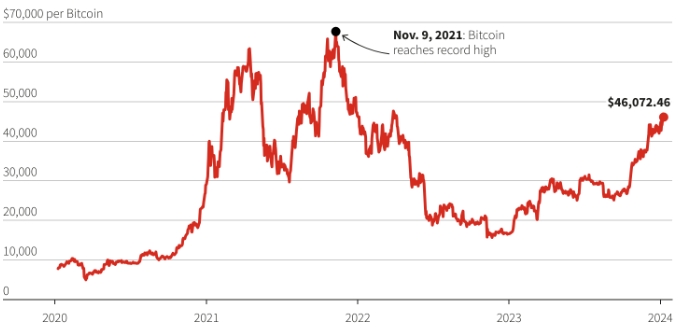 Старт биткоин-ETF торговли привел к росту цены самой популярной криптовалюты до максимального уровня с декабря 2021 года.