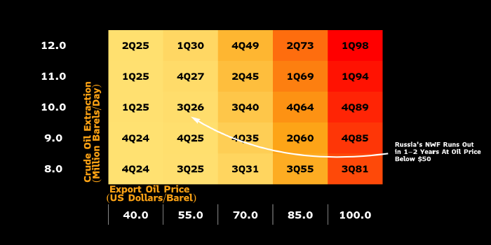 Средств Фонда национального благосостояния (ФНБ), который помог России смягчить негативные последствия санкций, хватит еще на один-два года, если экспортная цена российской нефти опустится ниже $50 за баррель. Как только ФНБ будет потрачен, возможности российского бюджета существенно сократятся. Эти оценки сходны с результатами нашего анализа годичной давности.