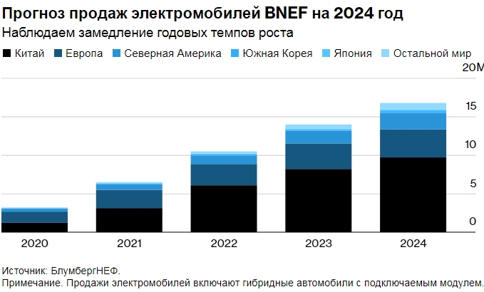 Прогноз продаж электромобилей BNEF на 2024 год. Наблюдаем замедление годовых темпов роста. Источник: Блумберг. Примечание. Продажи электромобилей включают гибридные автомобили с подключаемым модулем.