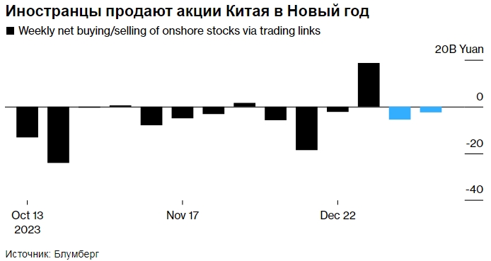 По данным Bloomberg, глобальные фонды продали акции на 7,9 млрд юаней (1,1 млрд долларов) за первые две недели 2024 года после крупных покупок в последнюю неделю прошлого года. Настроения оставались пессимистичными, поскольку дефляционное давление сохраняется, а политическая поддержка не впечатляет.