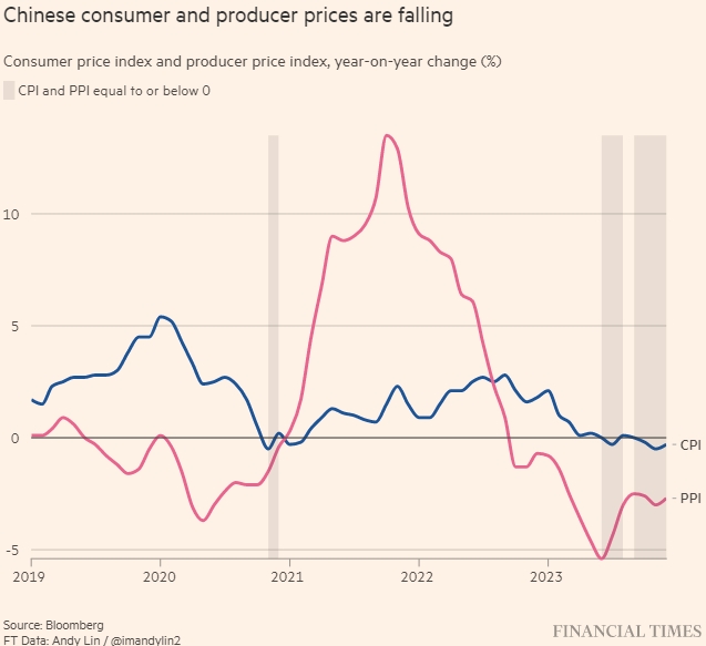 Китайские потребительские цены и цены производителей падают. Индекс потребительских цен (CPI) и индекс цен производителей (PPI), изменение за год (%). Источник: Bloomberg. Данные FT: Энди Лин