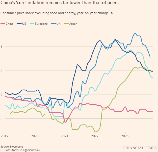 Базовая инфляция в Китае остается намного ниже, чем в других странах. Индекс потребительских цен без учета продуктов питания и энергоносителей, изменение за год (%). Источник: Bloomberg. Данные FT: Энди Лин