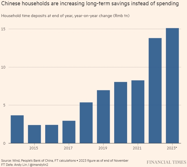 Китайские домохозяйства увеличивают долгосрочные сбережения вместо расходов. Срочные депозиты домохозяйств на конец года, изменение за год (трлн юаней). Источник: Wind, Народный банк Китая, расчеты FT - показатель 2023 года по состоянию на конец ноября. Данные FT: Энди Лин