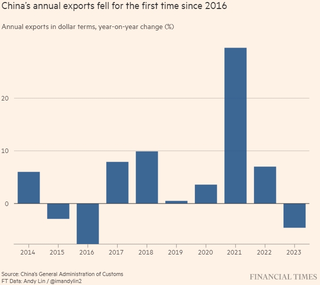 Годовой объем экспорта Китая снизился впервые с 2016 года. Годовой экспорт в долларовом выражении, изменение за год (%). Источник: Главное таможенное управление Китая. Данные FT: Энди Линь