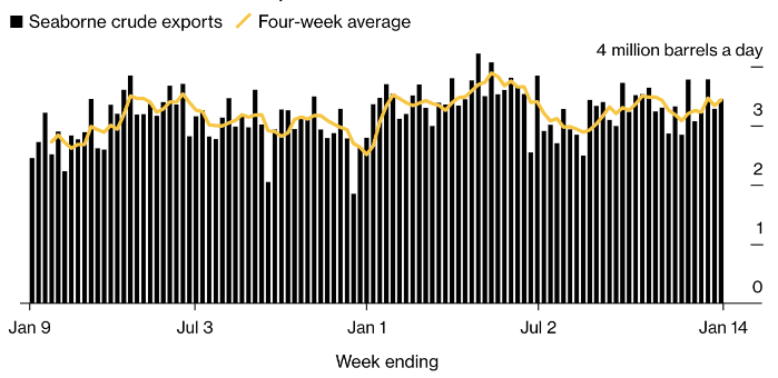 Валовая стоимость российского экспорта сырой нефти, рассчитанная на основе еженедельных поставок и данных о ценах Argus Media, выросла до $1.56 млрд за семь дней до 14 января по сравнению с $1.45 за предыдущий период. Средний доход за четыре недели вырос на $58 млн и достиг максимального значения за семь недель на уровне $1.55 млрд в неделю.