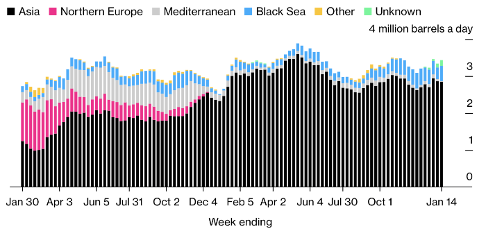 Вся российская нефть, предназначенная для азиатских покупателей после погрузки в западных портах, продолжает проходить через Красное море, несмотря на нападения на торговые суда со стороны йеменских повстанцев-хуситов. Танкеры, перевозящие российскую нефть, вряд ли будут преднамеренно атакованы, однако они могут попасть под удар по ошибке.