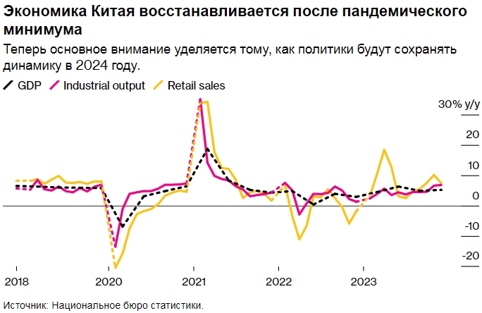 Экономика Китая восстанавливается после пандемического минимума. Теперь основное внимание уделяется тому, как политики будут сохранять динамику в 2024 году. Источник: Национальное бюро статистики.