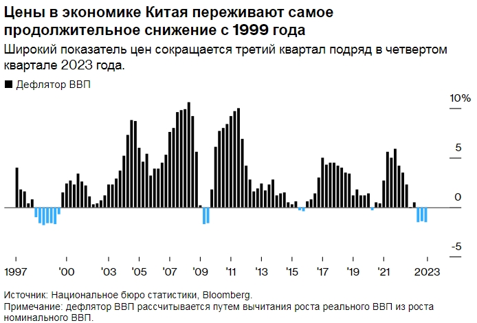 Дефляционное давление не исчезнет: последние данные показывают, что цены в декабре упали третий месяц подряд. Дефлятор ВВП — широкий показатель цен — упал на 1,5% в период с октября по декабрь, согласно расчетам Bloomberg, основанным на официальных данных, опубликованных в среду. Это ознаменовало третий квартал подряд снижения.