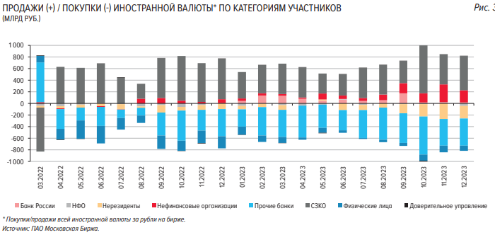 Основными продавцами иностранной валюты все так же выступали системно значимые кредитные организации (СЗКО), которые действовали по поручению российских экспортеров, реализуя их валютную выручку. Объем нетто-продаж иностранной валюты СЗКО составил в декабре 588,2 млрд руб. (+14% м/м).