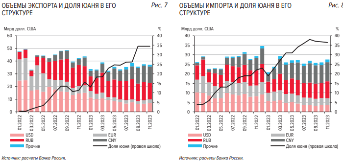 Доля юаня в экспортной выручке РФ осталась в ноябре на уровне 34,5%, составив 12,8 млрд долл. США, в импорте — снизилась на 0,4 п.п. до 36,4% (в стоимостном выражении -10,0 млрд руб.).