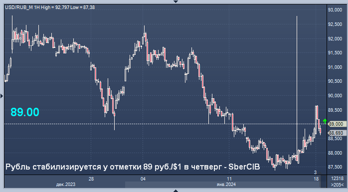 "Рубль потерял в среду чуть более 1%, ослабев до 89 руб./$1, а в четверг утром дешевеет до 89,2 руб./$1. Похоже, что временное резкое ослабление во вторник, связанное с техническими факторами, вызвало рост спроса на валюту. Тем не менее на этих уровнях экспортеры могут нарастить продажи, и рубль стабилизируется у 89 руб./$1", - пишут эксперты Сбербанка.