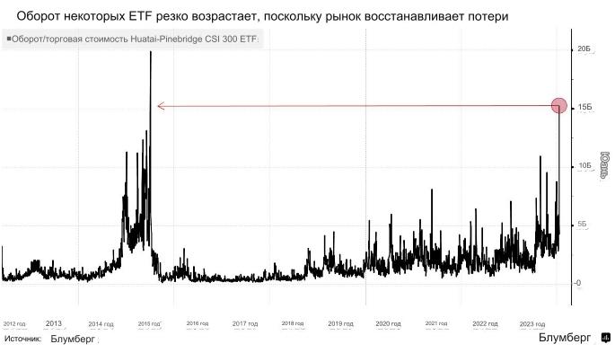 Торгуемая стоимость Huatai-Pinebridge CSI 300 ETF выросла до 15,3 млрд юаней ($2,1 млрд) в четверг, что является самым высоким показателем с 2015 года, в то время как стоимость Harvest CSI 300 Index ETF и E Fund CSI 300 ETF также продемонстрировала необычайный рост. Это совпало с ростом индекса CSI 300 акций материкового Китая, который закрылся на 1,4% ростом после снижения на 1,8% ранее.