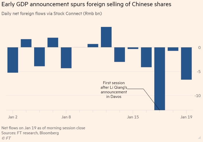 Неожиданное заявление премьера Китая - на день раньше запланированного срока - о том, что рост экономики в прошлом году составил "оценочные" 5,2 процента, было воспринято инвесторами негативно, усилив зарубежные продажи китайских акций. Ежедневные чистые иностранные потоки через Stock Connect (млрд юаней). Источники: исследование FT, Bloomberg. ©ФТ