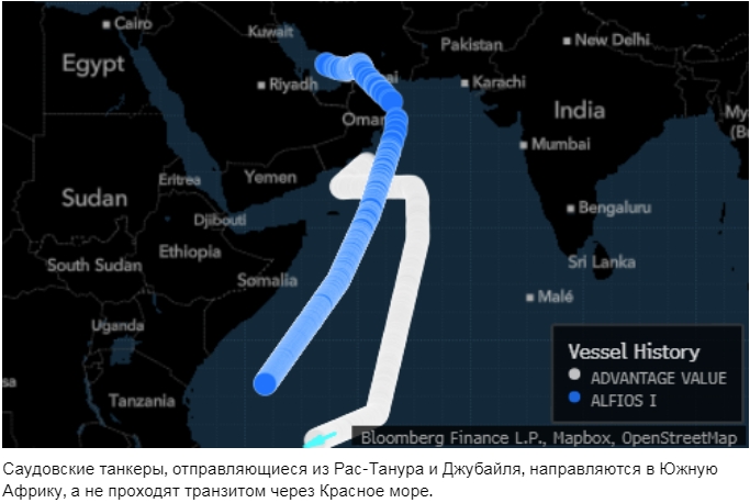 Отклонившиеся суда направляются вокруг Африки. Это более длительный путь с Ближнего Востока к нефтеперерабатывающим предприятиям и потребителям в Европе. Обход может увеличить время плавания более чем на две недели по сравнению с рейсом из Персидского залива через Красное море и Суэцкий канал.