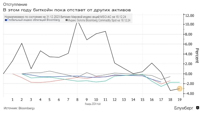 Биткойн вырос на 157% в прошлом году на оптимизме по поводу возможного запуска 11 января первых в США биржевых фондов, которые напрямую будут покупать и хранить токен. Цифровые активы также получили попутный ветер от ставок на более мягкую денежно-кредитную политику. Трейдеры сейчас оценивают, сколько денег привлекают ETF, и корректируют ожидания снижения процентных ставок.