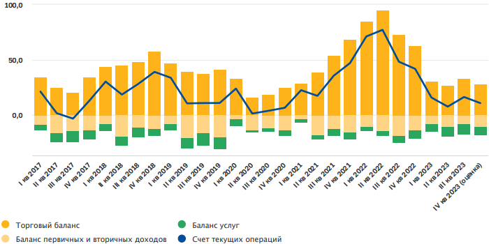 Компоненты текущего счета платежного баланса в 2017–2023 годах, млрд долларов США. Источник: Банк России