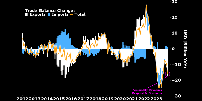 Изменение компонентов торгового баланса РФ в млрд долларов США г/г: экспорт (белым), импорт (голубым), баланс (оранжевым). Надпись фиолетовым: «доходы от экспорта сырья резко снизились в декабре». Источник: Bloomberg