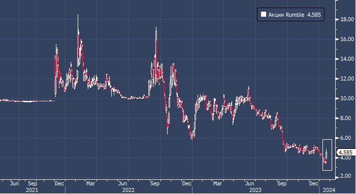 Акции видеохостинговой платформы Rumble (RUM), также начинают позитивный этап своей биржевой истории. Они подскочили в цене на 33% до $4,77. Rumble объявила о партнерстве с медиакомпанией Barstool Sports.