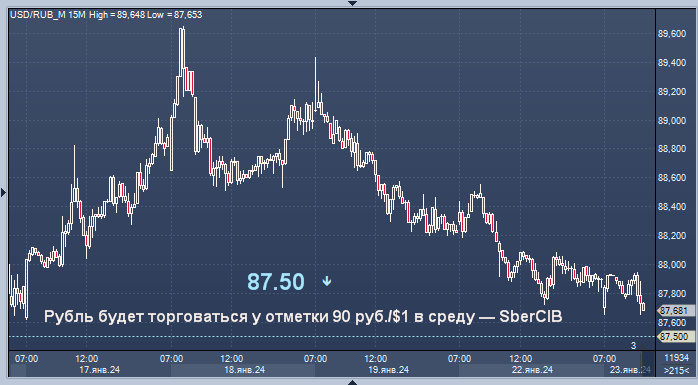 "Рубль в понедельник укрепился на 0,5% до 87,8 руб./$1. Обороты торгов были невелики, но все же подросли, что может говорить о повышении активности экспортеров перед налоговыми и дивидендными выплатами. В этих условиях рубль сегодня может закрепиться около 87,5 руб./$1", - сообщили в Сбербанке.