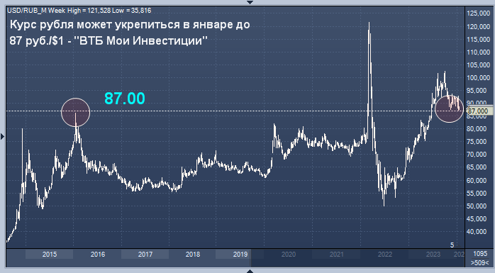 Курс рубля может укрепиться в январе до уровня 87 руб./$1, а в феврале-марте текущего года возможно его укрепление до 85-90 руб./$1, говорится в комментарии инвестиционного стратега "ВТБ Мои Инвестиции" Алексея Михеева.