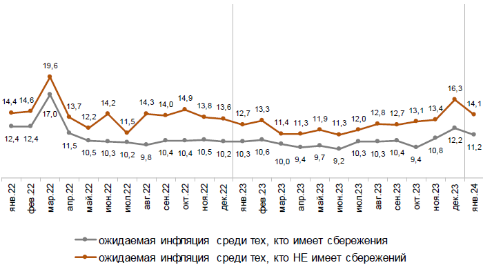 Кроме того, ожидаемая инфляция среди тех россиян, кто имеет сбережения, замедлилась до 11,2% г/г с декабрьских 12,2% г/г, а среди тех, кто сбережений не имеет, — замедлилась до 14,1% г/г с декабрьских 16,3% г/г.