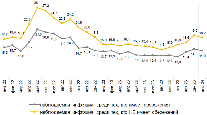Наблюдаемая инфляция среди тех россиян, кто имеет сбережения, замедлилась до 14,0% г/г с декабрьских 14,5% г/г, а среди тех, кто сбережений не имеет, — замедлилась до 18,2% г/г с декабрьских 19,0% г/г.