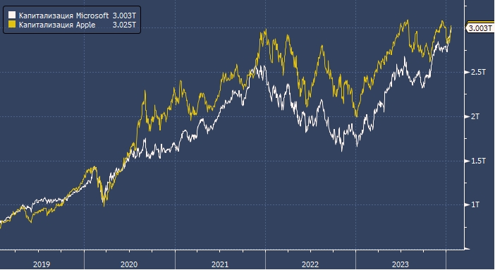 Цена акций Microsoft достигла рекордного уровня $404,72, увеличившись на 1,5%, что позволило технологическому гиганту превысить рыночную капитализацию в $3 трлн. По данным LSEG, акции Apple торговались на уровне $195,47, увеличившись на 0,14%, что дает рыночную стоимость компании в $3,02 трлн.