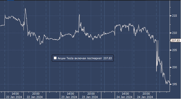 Автопроизводитель сообщил о прибыли в размере 71 цента на акцию в четвертом квартале 2023 года, что ниже средней оценки в 73 цента на акцию. Выручка Tesla составила 25,2 миллиарда долларов, что меньше прогнозируемых 25,9 миллиарда долларов.
