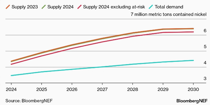 Прогноз динамики спроса и предложения на никель. Оценки BNEF предполагают, что рынок будет профицитным на горизонте до 2030 года.