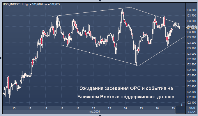 Индекс доллара, который измеряет курс валюты США по отношению к валютам шести конкурентов, в понедельник практически не изменился и составил 103,50, оставаясь вблизи шестинедельного максимума 103,82, которого он достиг на прошлой неделе. Индекс настроен на рост на 2% в январе, поскольку трейдеры корректируют чрезмерные ожидания раннего и глубокого снижения процентных ставок в США.