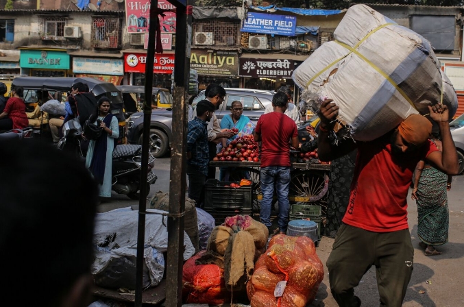 Рабочий несет товары в районе Дхарави в Мумбаи. Фотограф: Дирадж Сингх/Bloomberg
