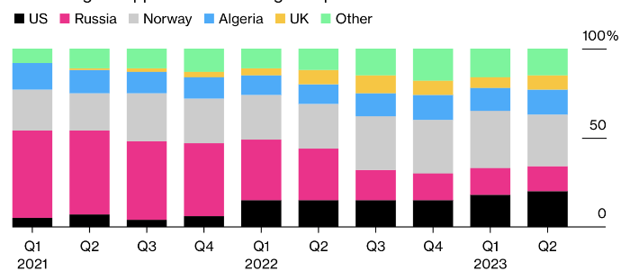 В 2023 году США импортировали в Европу почти половину всего потребляемого регионом газа. Источник: Bloomberg