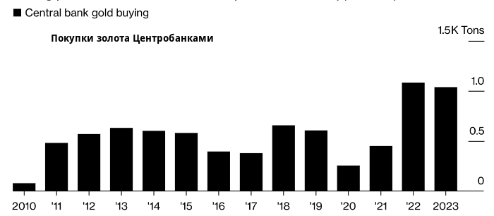 Центральные банки скупали золото головокружительными темпами, при этом ежегодные чистые закупки в прошлом году составили 1 037 тонн, что всего на 45 тонн меньше рекорда, установленного в 2022 году, говорится в отчете WGC. Ожидается, что закупки центрального банка превысят 500 тонн в этом году. Ожидаемый внебиржевой бум, а также покупки центральным банком компенсируют падение спроса в других сегментах, в частности, со стороны биржевых фондов. По словам Каватони, цена может подняться до $2200 за унцию или выше. В декабре спотовые цены на золото достигли пика на уровне $2135.39.