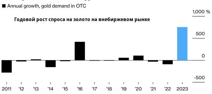 Комплексный показатель спроса включает в себя инвестиционные слитки, ювелирные изделия, монеты, покупку центральным банком, биржевые фонды и внебиржевую деятельность. По словам Каватони, на этом последнем рынке участники, включая суверенные фонды, состоятельных физических лиц и хедж-фонды, инвестируют в золотые слитки.