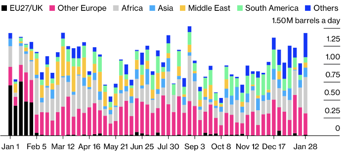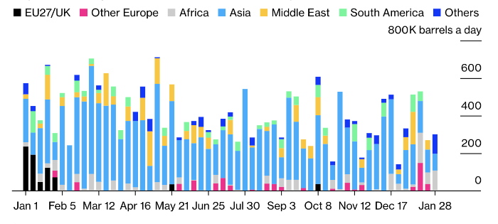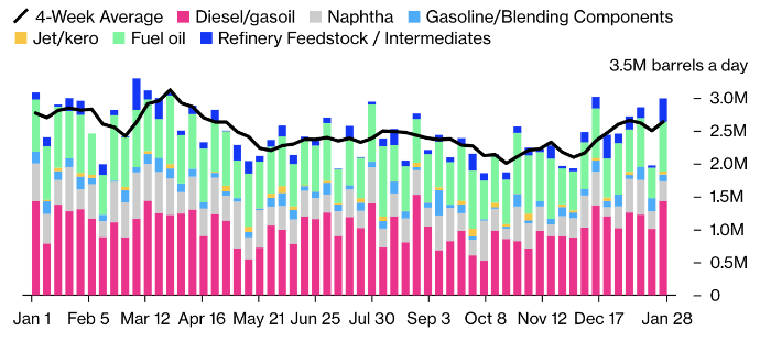 По данным аналитической компании Vortexa, за четыре недели до 28 января Россия экспортировала в среднем по 2.63 млн баррелей в день. Это примерно на 134,000 баррелей или на 5% выше пересмотренного показателя за предыдущую неделю. Более волатильные недельные потоки выросли на 52% по сравнению с пересмотренным показателем за предыдущую неделю и достигли 2.99 млн баррелей в день.