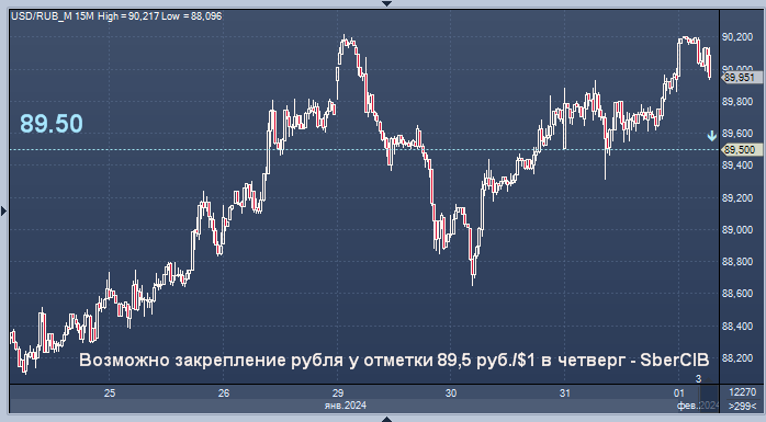 "Большую часть торгов среды рубль держался около 89,7 руб./$1, но вечером ослаб до 90 руб./$1. Обороты по паре CNY/RUB были невелики, что говорит об умеренной активности экспортеров. Этим утром рубль подешевел до 90,2 руб./$1, причем в понедельник на этом уровне экспортеры резко активизировались, и рубль тогда укрепился на 1%. Возможно, так будет и сегодня, и рубль закрепится около 89,5 руб./$1", - полагают аналитики SberCIB Investment Research.