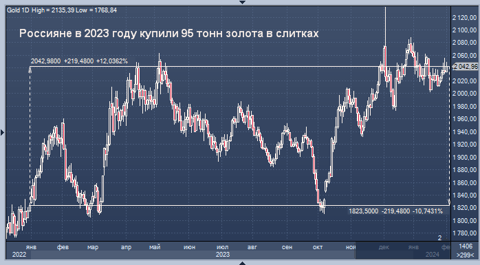 Закупки золотых слитков розничными потребителями в России в 2023 году составили порядка 95 тонн, рассказал журналистам замминистра финансов РФ Алексей Моисеев. Для сравнения, в 2022 году, по уточненным данным Минфина, эта цифра была около 100 тонн. Основные объемы покупок пришлись на IV квартал года, когда начала действовать "курсовая" экспортная пошлина.